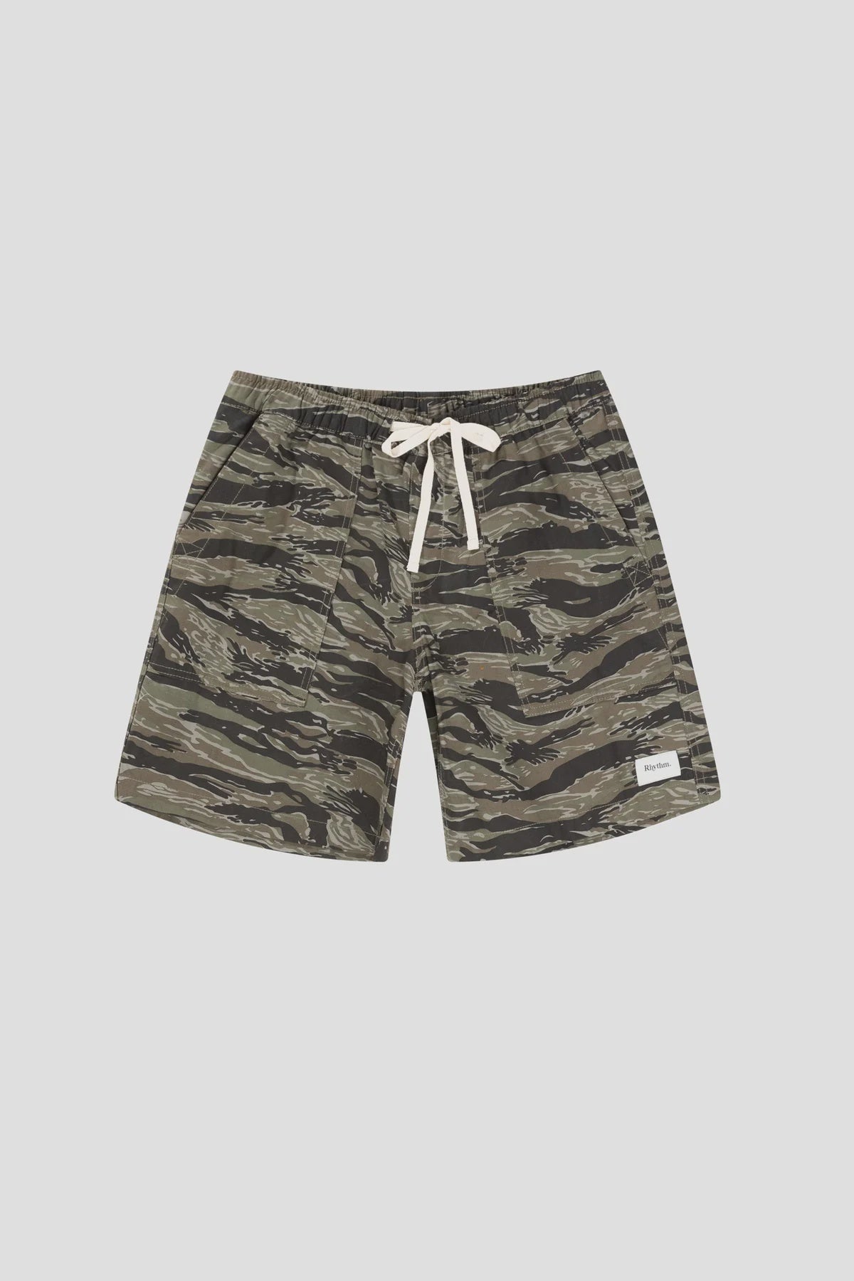 Meet the Rocco Jam Camo shorts, designed for coastal comfort. Featuring an elastic waist with a cream drawcord, 19-inch outseam, and a sewn main label at the front waistband and center of the back pocket. Perfect for casual style with a touch of adventure.