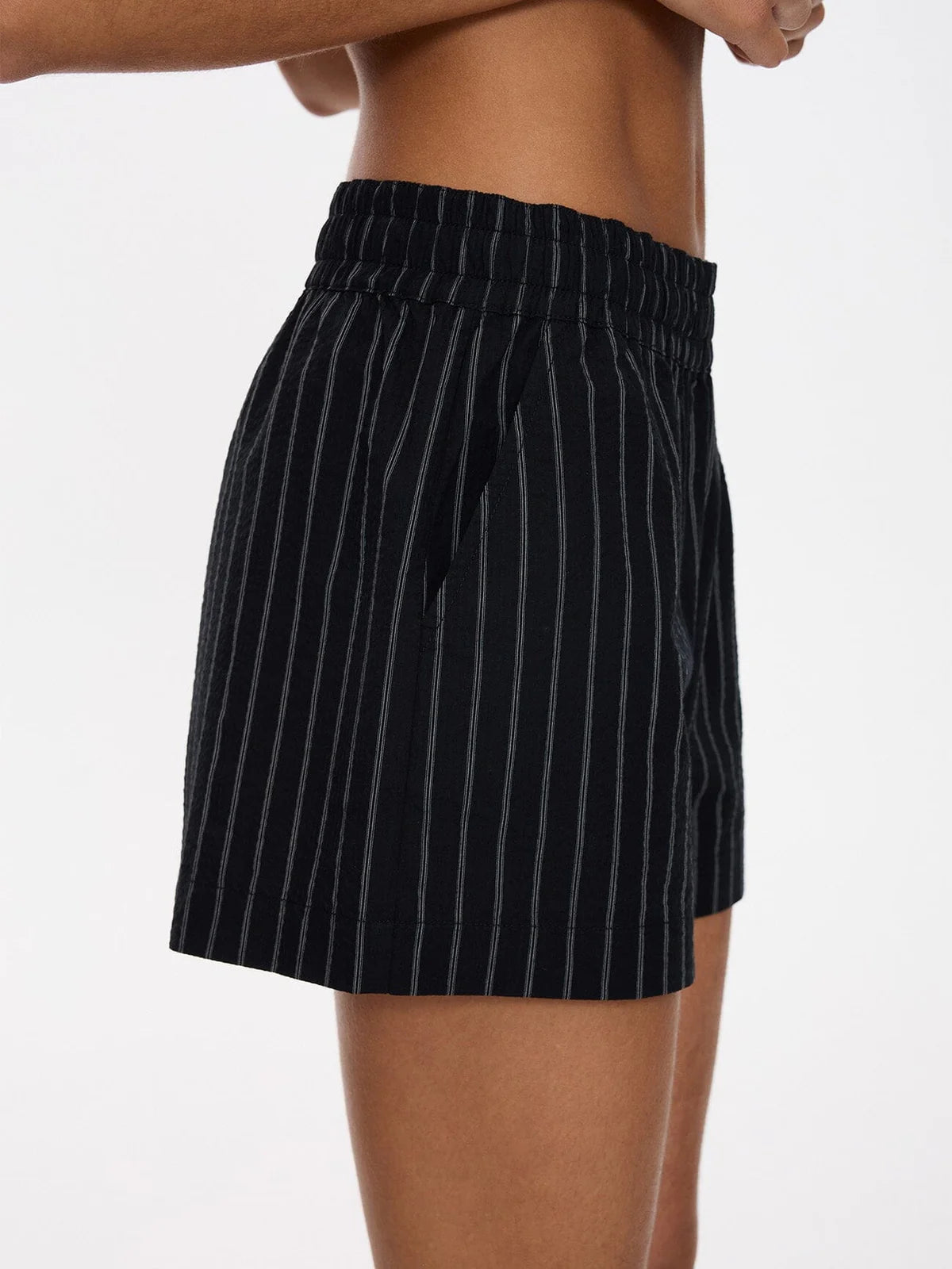 Relaxed and ready for anything, the Unwind Stripe Elastic Short in Black is your new go-to for effortless styling and summer unwinding. Made from breathable 100% cotton yarn dye stripe seersucker, these women's shorts au feature a comfy elastic waistband and a loose, relaxed fit that's perfect for warm-weather days. The black base with fine vertical stripes adds a sleek, tailored edge while still keeping it casual. Pair with the matching Unwind Stripe Oversized Shirt for a head-turning coord set.
