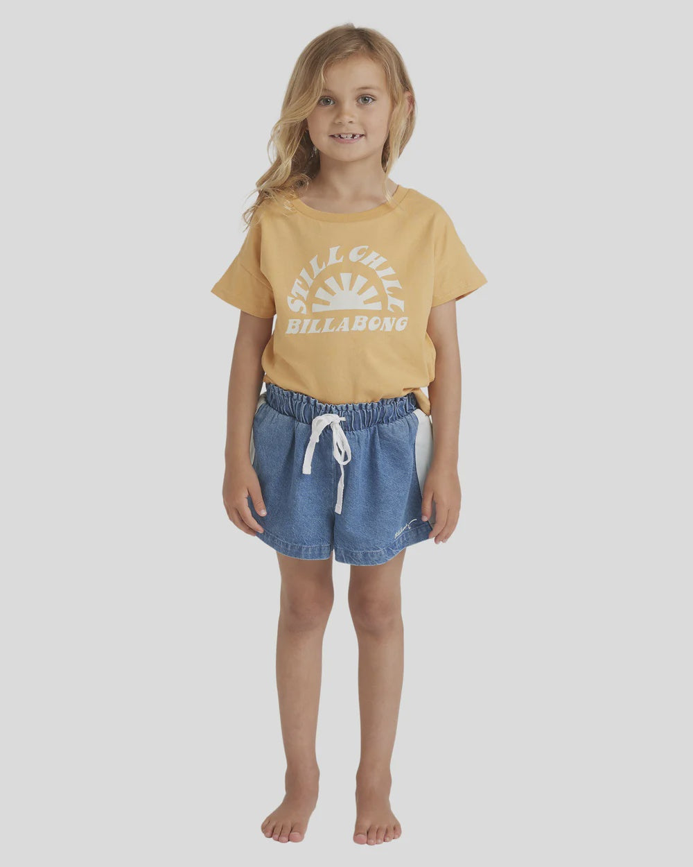 The cutest little denim shorts with a pretty little webbing detail and matching drawstring.
